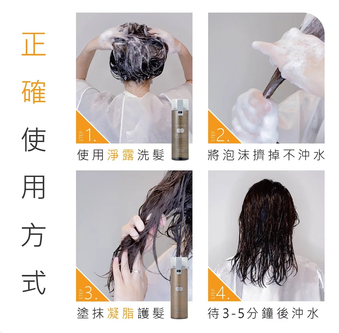 1. 用溫水徹底沖濕頭髮(大約沖洗1分鐘),因為水能夠打開頭髮最表層。 2. 在掌心猜到起泡沫,再塗在髮中到髮尾。(不要直接將洗頭水放頭皮) 3. 當髮中到髮尾都有泡的時侯,可將髮尾放在髮根位置打圈猜到起泡。 4. 輕輕按髮中髮尾1分鐘,然後將泡沫擠掉不用沖水。 5.然後搽喚羽凝脂(護髮素)待3-5分鐘後沖水便可。