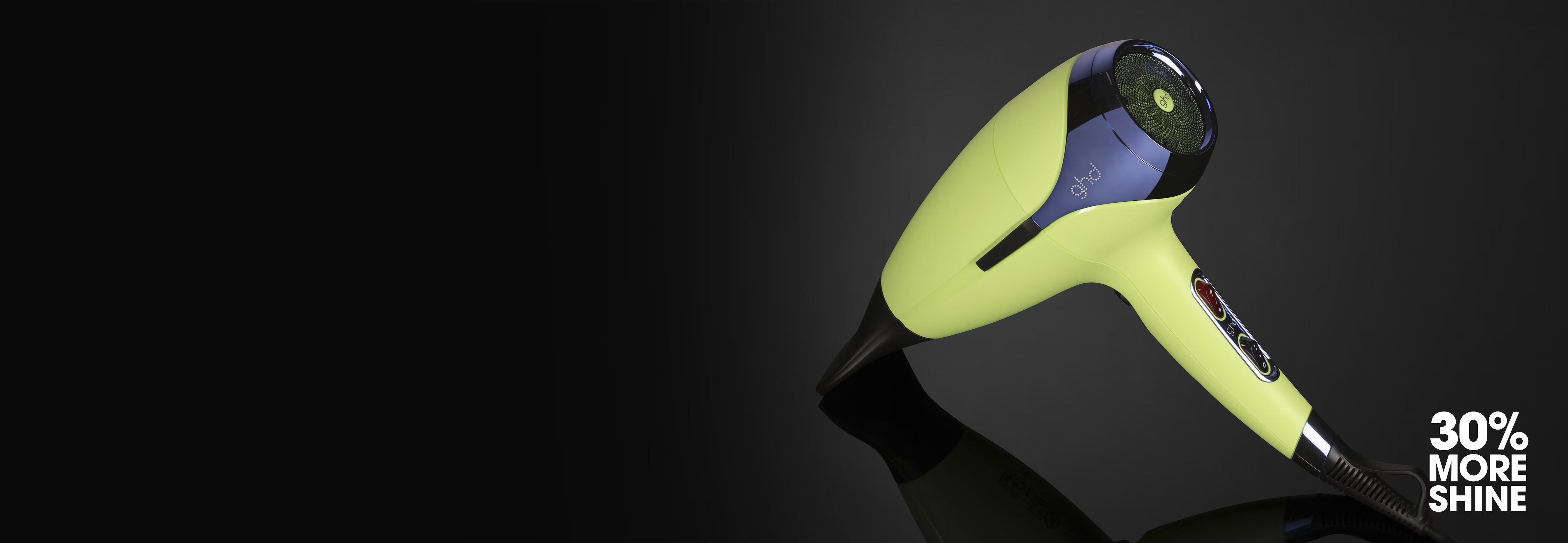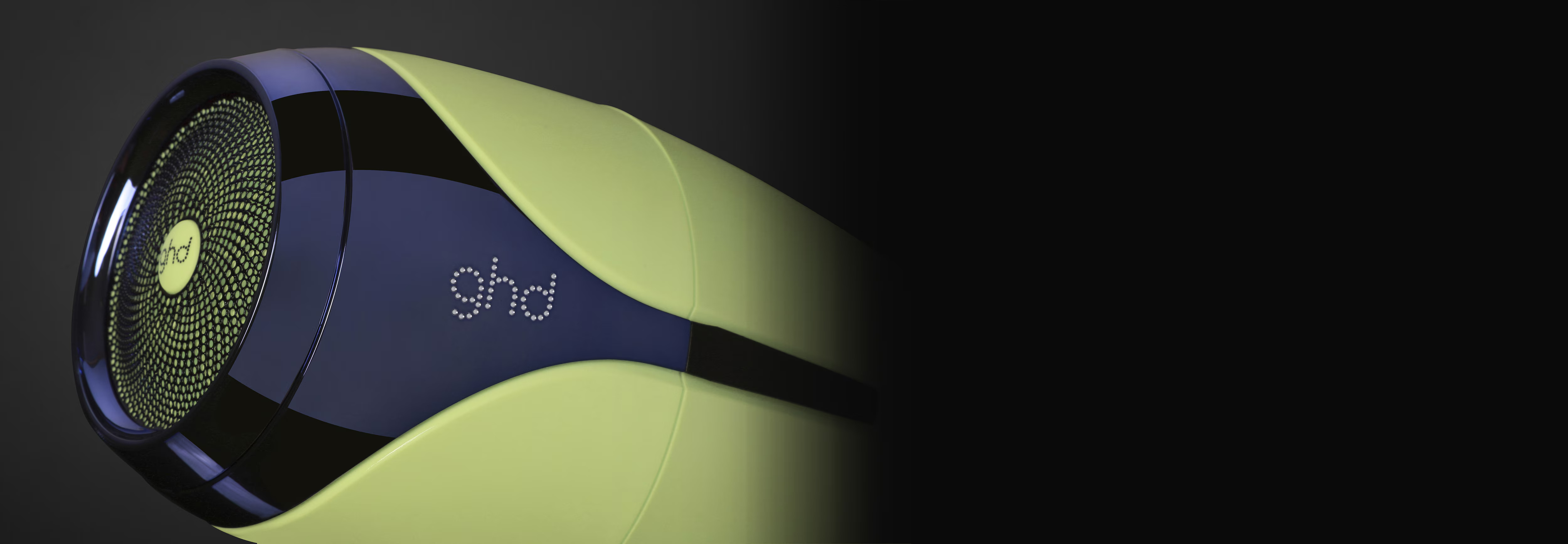 ghd Helios限量版專業風筒以炫目的螢光青檸色配上矢車菊藍色金屬質感,隨附相配的收納塵袋。